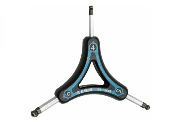 Clé Allen en forme triangulaire, à 3 têtes hexagonales. Donne l’occasion de manœuvrer les vis à tête creuse.