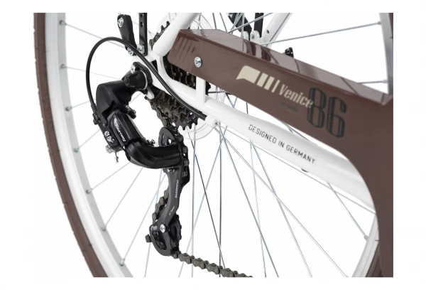 Pas de problème dans les montées avec les 21 vitesses du dérailleur SHIMANO. Let#39,inclinaison de la potence est réglable et, grâce à la selle suspendue, qui peut être réglée en fonction du poids du cycliste, les passages un peu accidentés seront amortis. Pour que chaque déplacement soit un plaisir!