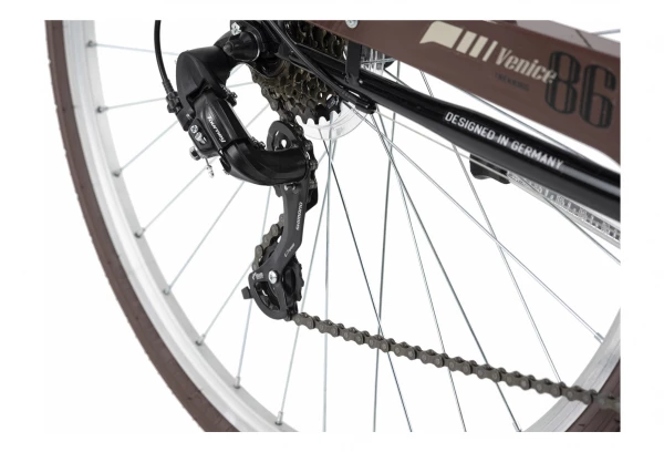 Pas de problème dans les montées avec les 21 vitesses du dérailleur SHIMANO. Let#39,inclinaison de la potence est réglable et, grâce à la selle suspendue, qui peut être réglée en fonction du poids du cycliste, les passages un peu accidentés seront amortis. Pour que chaque déplacement soit un plaisir!