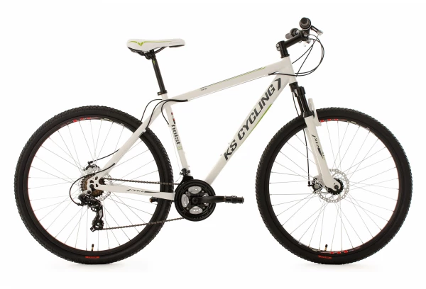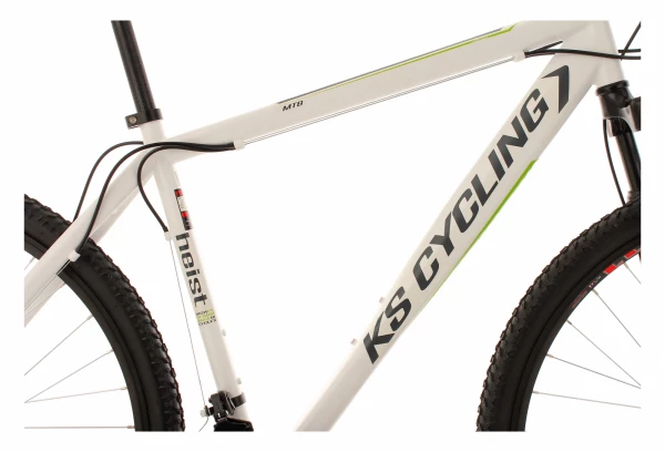 Le HEIST de KS Cycling établit de nouveaux critères en matière de design! Ce VTT de 29” enthousiasme par son cadre blanc et ses stickers vert et gris très élégants.