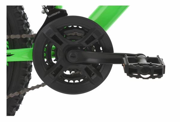 Côté sécurité, le freinage est assuré par des freins à disque mécaniques à l’avant et à l’arrière. Le vélo est également équipé d’un dérailleur 21 vitesses de SHIMANO. Les jeunes vététistes circulent en sécurité et avec style!